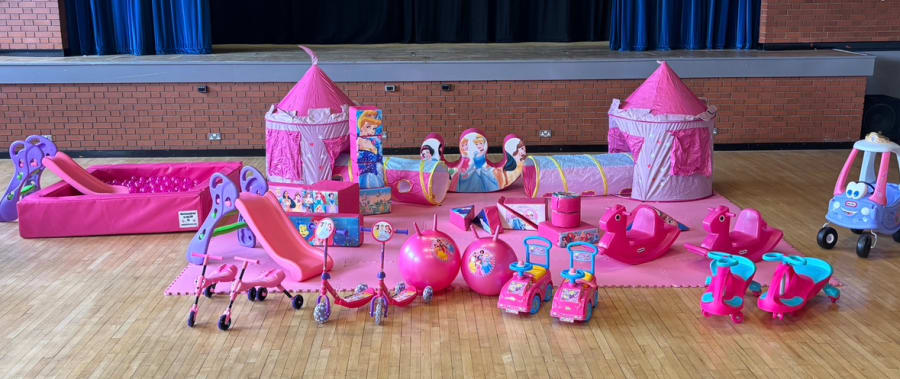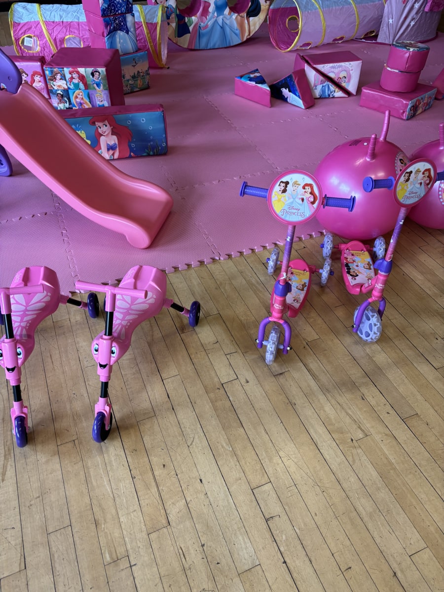 Princess Large Package Tent x2 *may vary Princess Ride On Cars x2 Princess Scooter x2 Pink Scuttle Bugs x2 Princess Soft Play Shapes x x17 Pink Tunnels x2 Pink Slides x2 Princess Hoppers x2