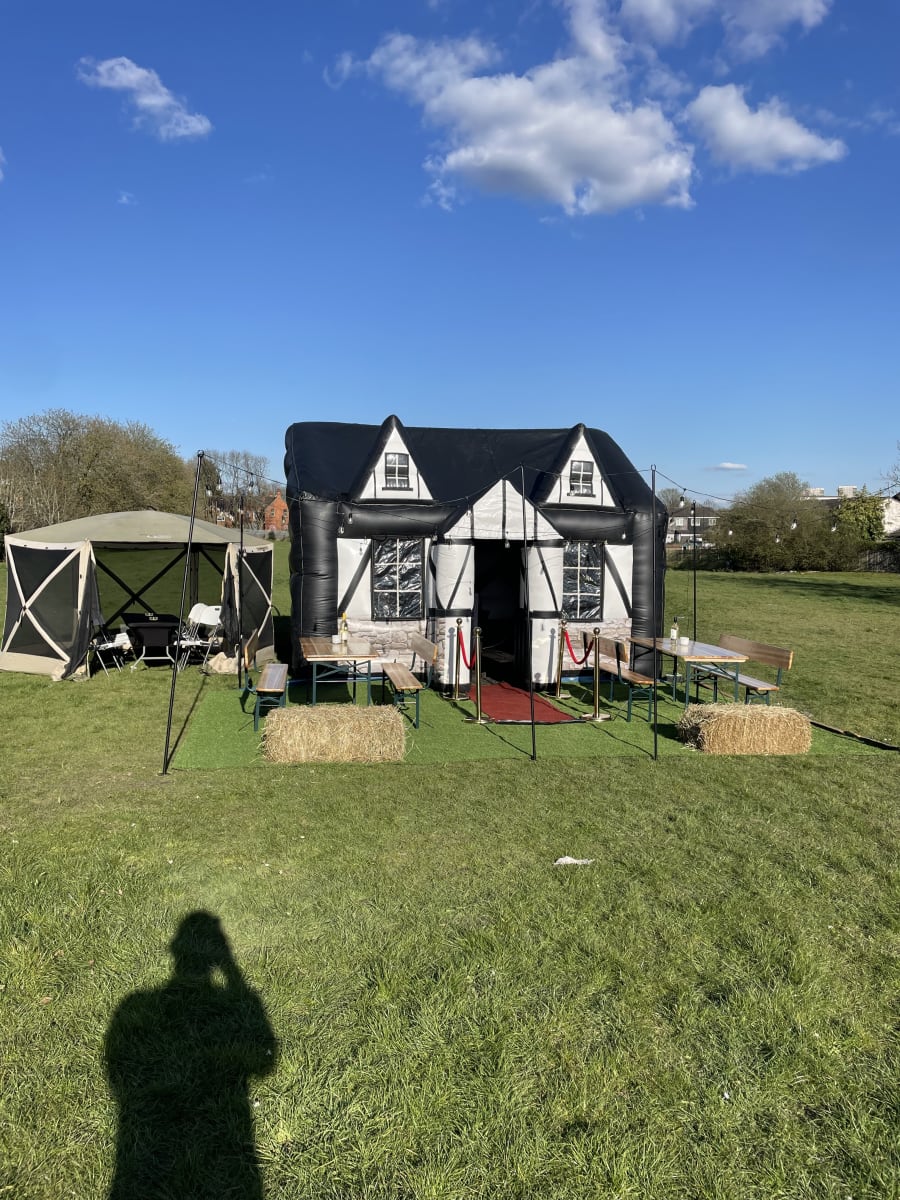 This is our Inflatable Tudor Pub that we have available to hire, which means that you can now have your local pub in your own back garden to enjoy with your friends and family. Enjoy a pint or two or maybe a large gin inside our brilliant inflatable pub. This feels the same as a real pub with amazing artwork and design.