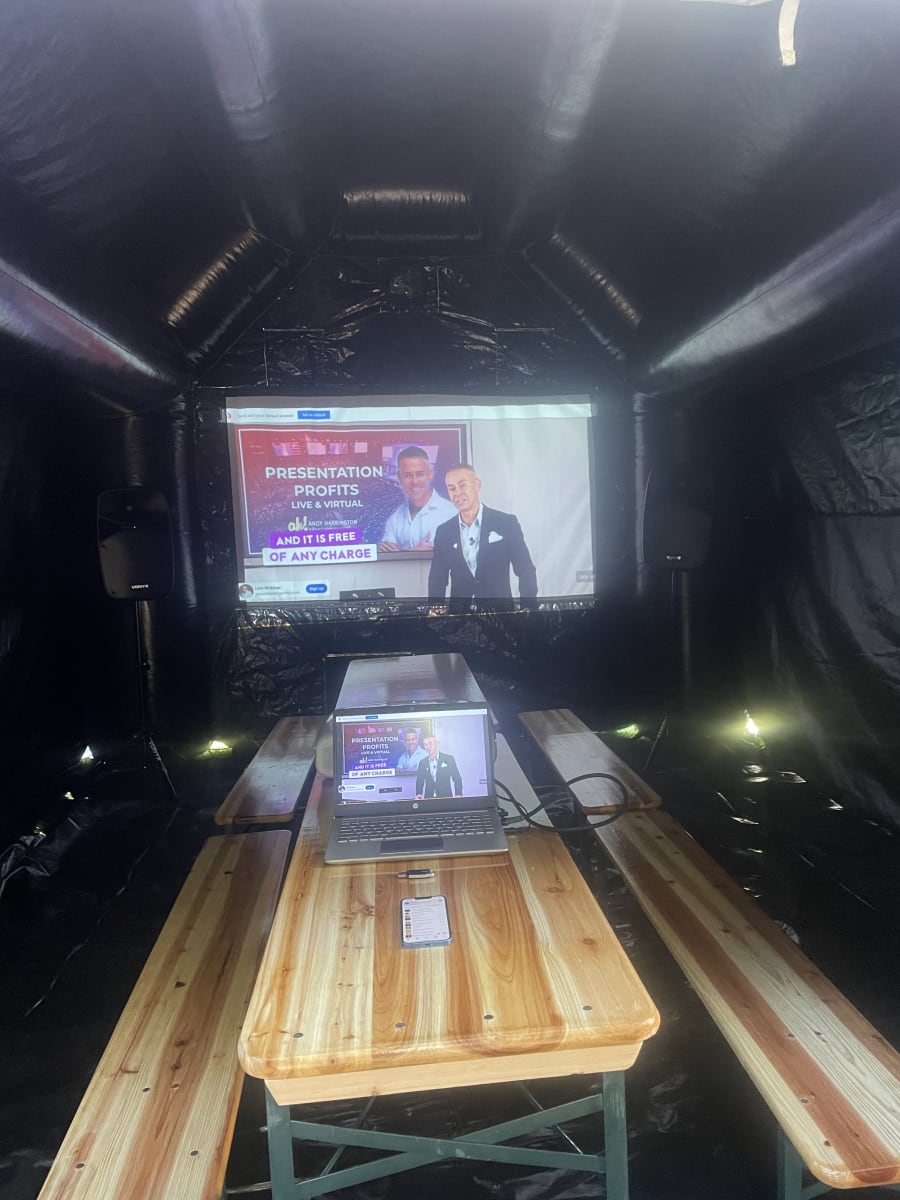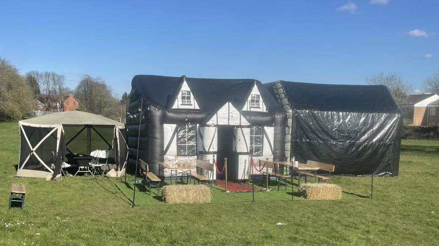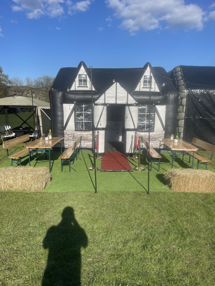 This is our Inflatable Tudor Pub that we have available to hire, which means that you can now have your local pub in your own back garden to enjoy with your friends and family. Enjoy a pint or two or maybe a large gin inside our brilliant inflatable pub. This feels the same as a real pub with amazing artwork and design.